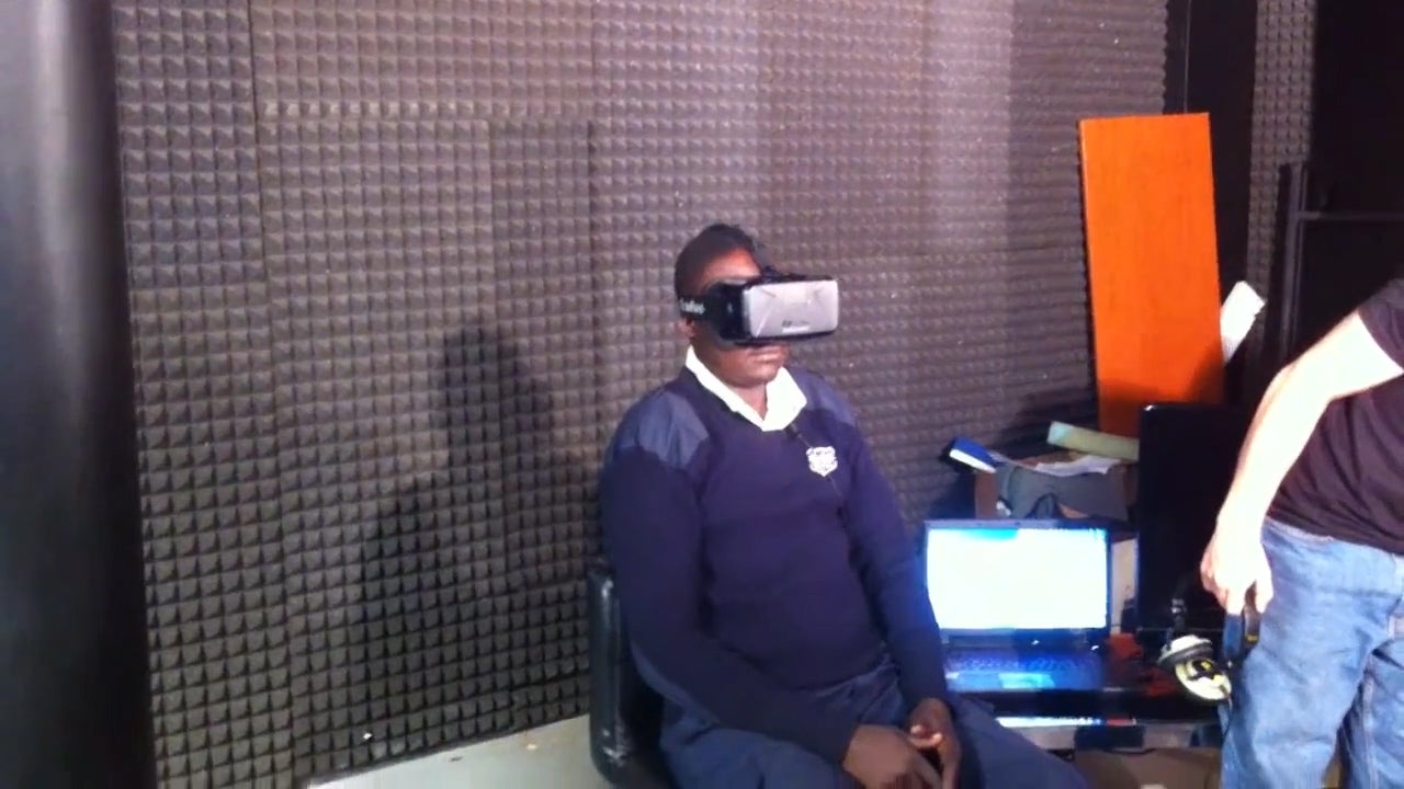 Der Mann aus Uganda ist sichtlich überwältigt von der Virtual-Reality-Brille.