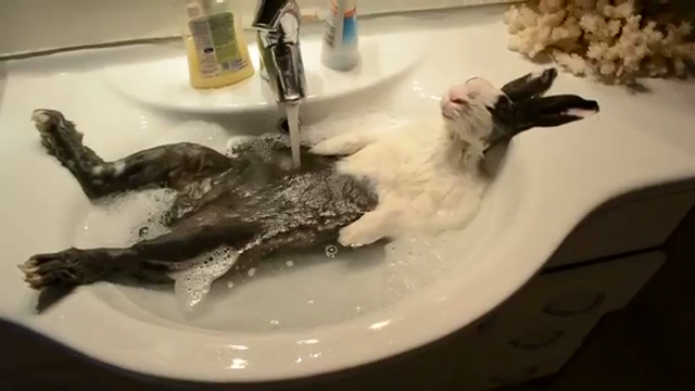Kaum zu glauben, dieser Hase lässt es sich im Waschbecken unter laufendem Wasser gut gehen und wird von seinem Besitzer "geduscht".
