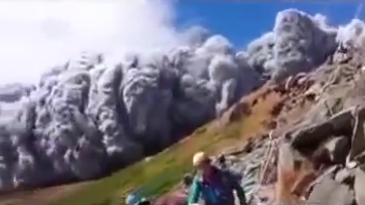 Diese Wanderer werden von einer gigantischen Aschewolke erfasst.
