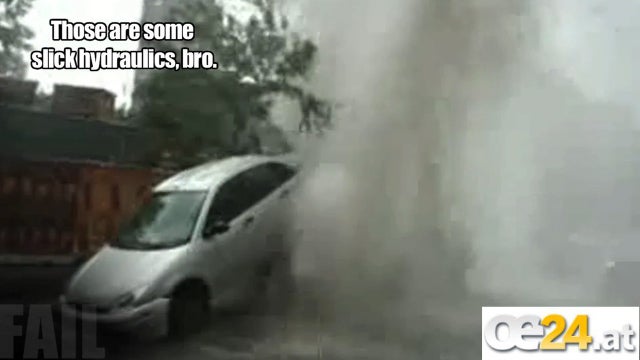 Schlecht geparkt - eindeutig! Dieser Fahrer konnte es zwar nicht wissen, doch er stellte sein Auto direkt über einem Wasserrohr ab. Welches platzte. Welch unglaublichen Druck Wasser hat, sehen Sie auf diesem Video