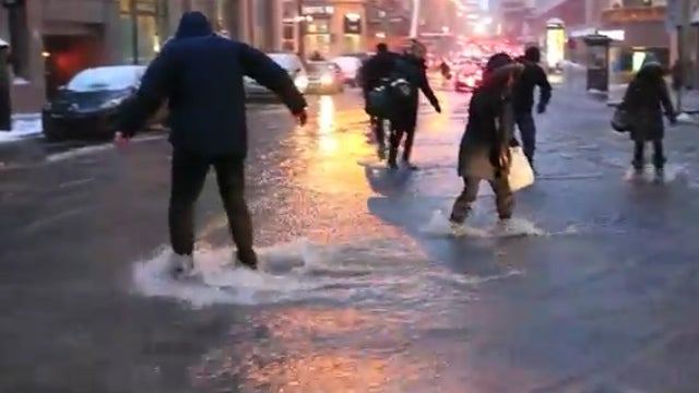 Nach dem Bruch eines Wasserrohres am Montagabend in der kanadischen Stadt Montreal kommt es zu spektakulären Szenen