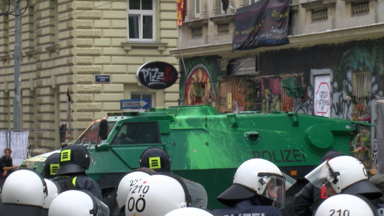 Zur Räumung der Pizzeria Anarchia umkreist die Exekutive das Haus im 2. Bezirk in Wien.