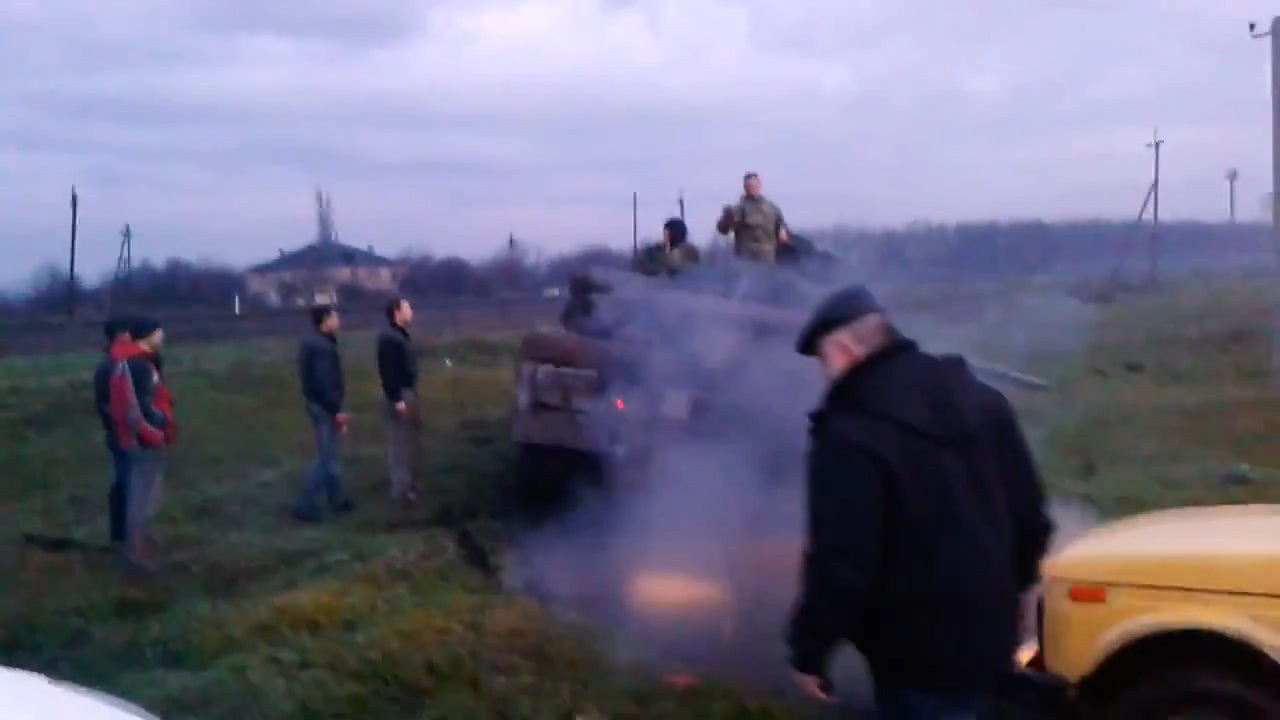 Ein Panzer rollt in Richtung Slowjansk. Auf dem Weg dorthin wird er von Zivilisten aufgehalten. Sie stellen sich vor den Panzer und hindern ihn an der Weiterfahrt.