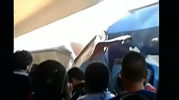 Eine Überwachungskamera filmt, wie ein Nahverkehrszug einen Prellbock im Bahnhof Once im Westen Buenos Aires rammt.