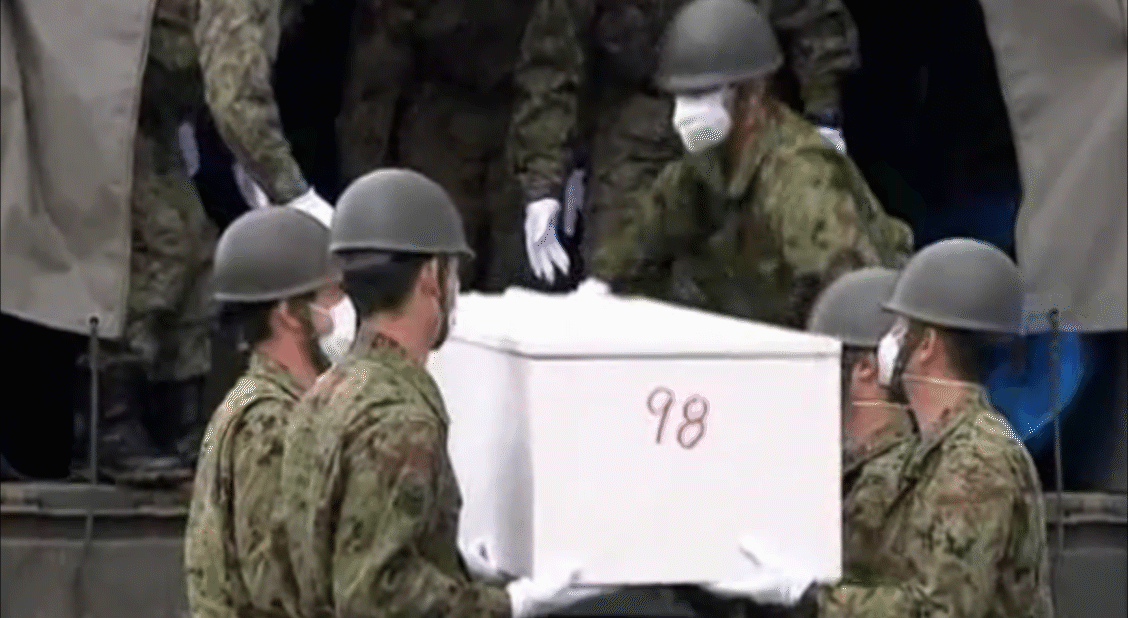 Ein Massengrab in Miyagi, Japan bietet eine temporäre Ruhestätte für die Opfer des verheerenden Erdbeben und Tsunami. Familienmitglieder sehen zu und legen Blumen während ihre Geliebten beerdigt werden.