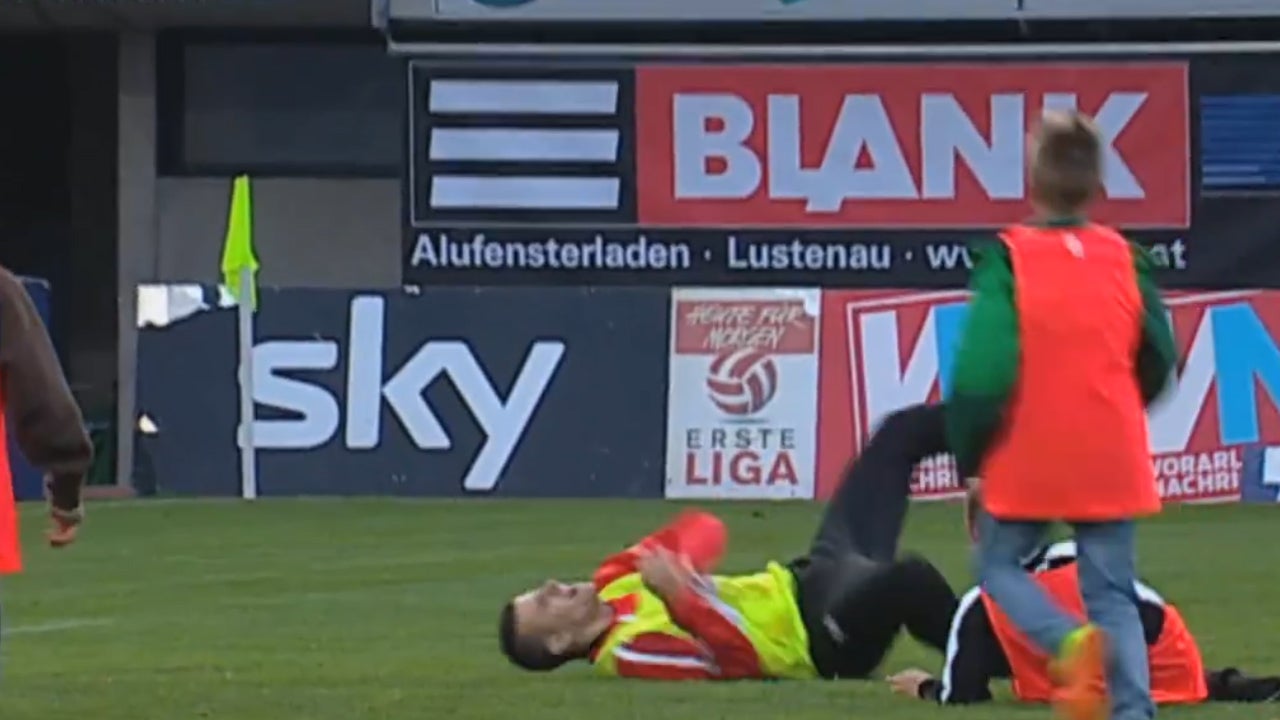 Es ist die Partie Austria Lustenau gegen Parndorf. In der Halbzeit macht sich Parndorfs Stürmer Marjan Markic warm und kann sich ein paar Tricks mit den Balljungen nicht verkneifen. Einem der Buben reicht es. Er setzt zur Grätsche an und holt den Profi von den Beinen. Am Ende konnten alle wieder lachen.