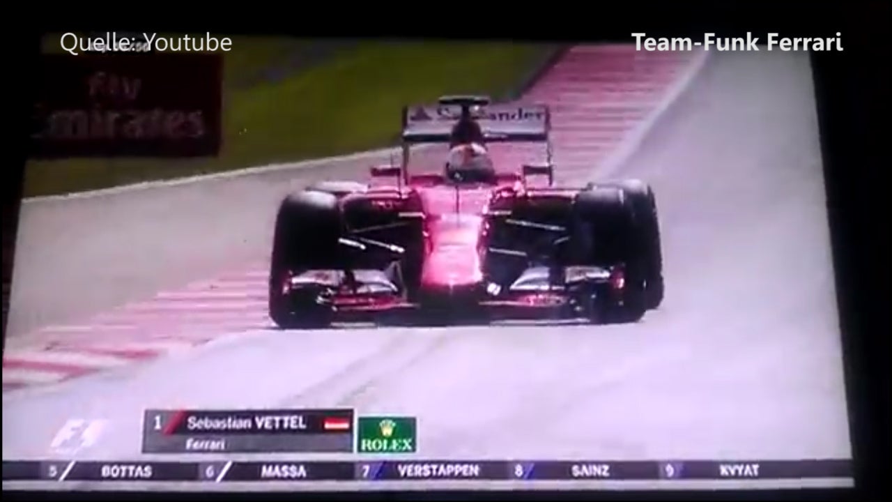 Die große Freude über Sebastian Vettels ersten Sieg im Ferrari ist hier zu hören.
