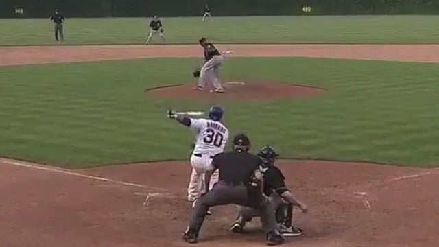Eine recht ungewöhnliche Art einen Ball zu fangen, zeigt Basballspieler Francisco Liriano von den Pittsburgh Pirates im 9. Innig im Spiel gegen die Chicaco Cubs. Der Catcher fängt den Ball während einer Drehbewegung zwischen seinen Beinen.