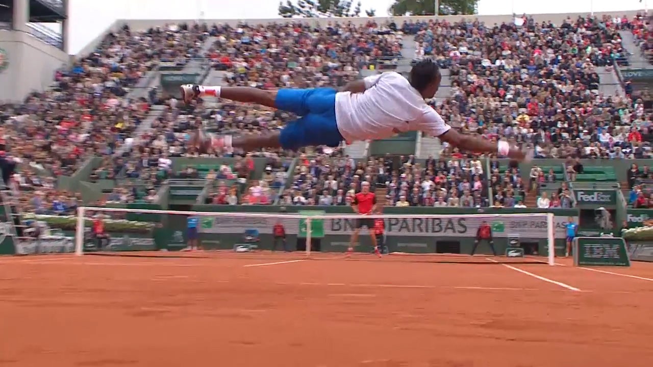 Gaël Monfils beweist unglaubliche Körperbeherrschung bei diesem Tennisschlag.