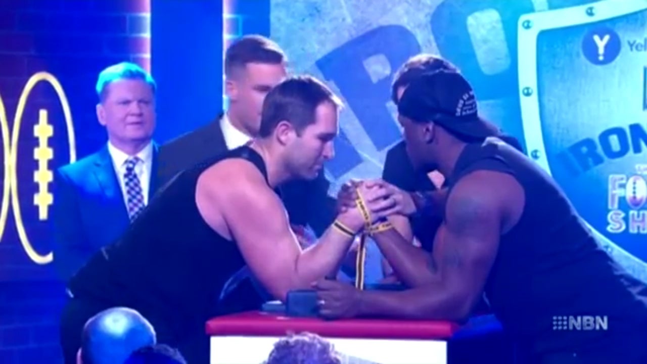 Live auf Sendung zieht sich hier ein starker Mann einen grausigen Armbruch zu.