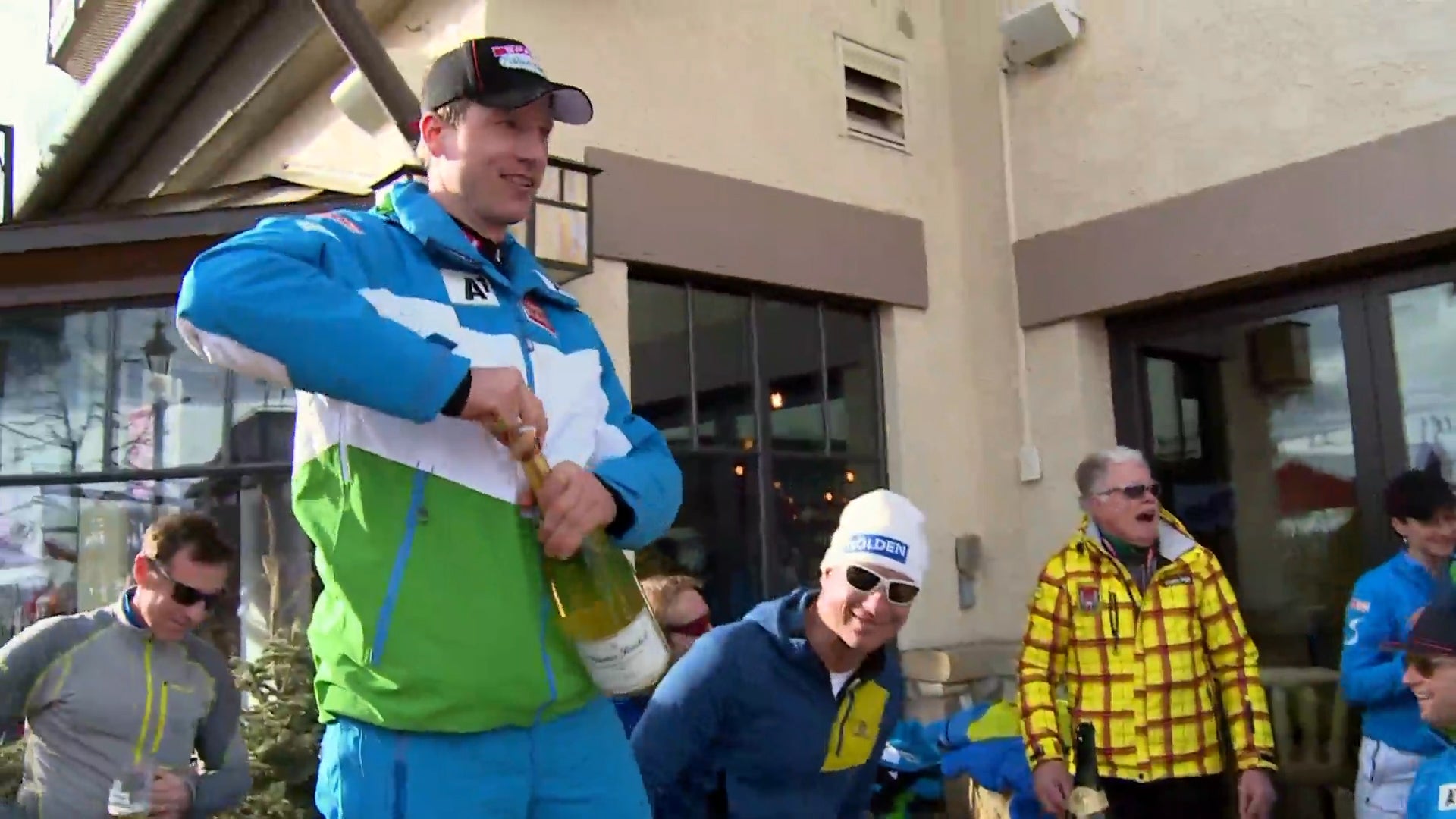 annes Reichelt feiert direkt nach dem Rennen seinen Weltmeistertitel in der Arlberg Lounge.