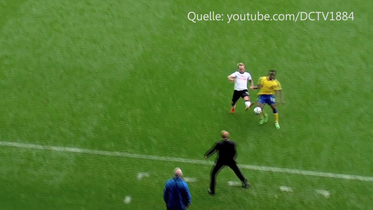 Wigan Athletic-Trainer Uwe Rösler wird in der Coachingzone umgehauen.