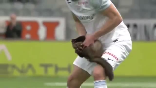 Tierische Szene beim Schweizer Erstligaspiel zwischen Zürich und Thun. Ein Marder stürmt das Spielfeld, beißt einen Spieler und kann nur mit Mühe gefangen werden.