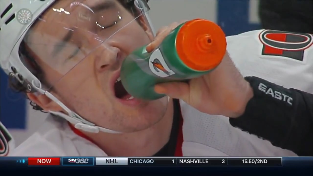Peinlich: NHL-Star Mark Stone hat große Probleme mit seiner Trinkflasche.