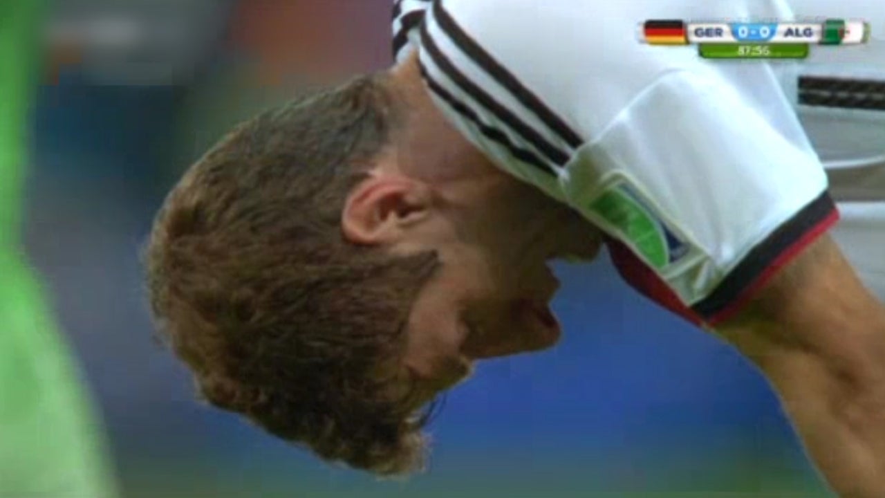 Ob der Freistoß so geplant war? Thomas Müller stolpert bei diesem Deutschland-Trick.