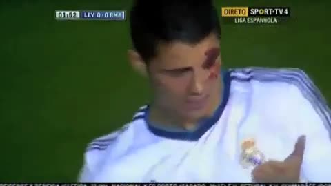 Beim 2:1-Sieg in Levante kriegt Reals Superstar nach zwei Minuten den Ellbogen von Levantes Abwehrspieler David Navarro ins Gesicht – Platzwunde! Ronaldo blutet heftig, spielt aber weiter und erzielt in der 21. Minute das 1:0 für Real.