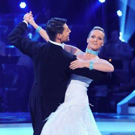 Die sportliche Alexandra Meissnitzer und ihr Tanzpartner Florian Gschaider in einem etwas zurückhaltenden langsamen Walzer zur Musik "Can You Feel The Love Tonight".