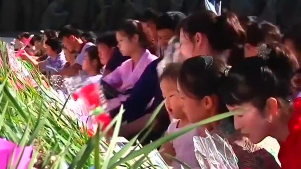 Hunderte Menschen legten Kim Il Sung zu Ehren Blumengebinde vor Statuen ab.