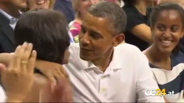 Bei einem Basketballspiel am Montag in Washington wurde plötzlich die Kuss-Kamera auf den US-Präsidenten samt Gattin gerichtet. Beide waren erst mal schüchtern, legten dann aber richtig los.