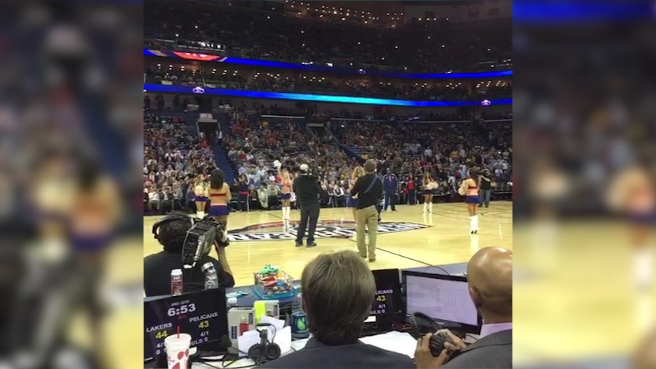 Komiker Will Ferrell schießt eine Cheerleaderin mit einem Ball ab.