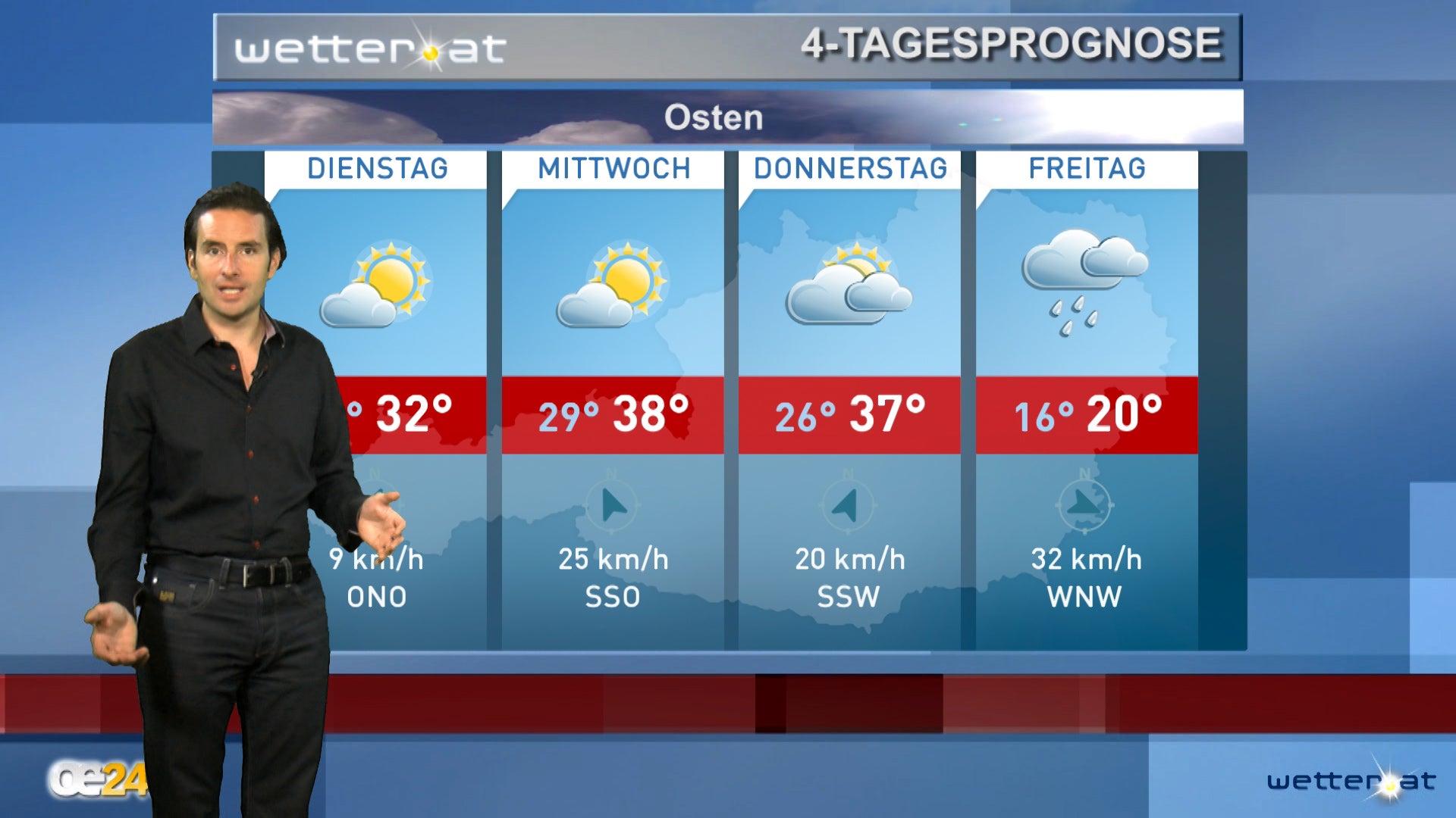 Eine nach Osten ziehende Störung sorgt zunächst noch für Restwolken, die tagsüber aufquellen können. Betroffen sind eher Oberösterreich, vor allem Niederösterreich, Wien und teilweise das Nordburgenland. Die Sonne kommt zwischendurch vor allem ab Mittag durch.