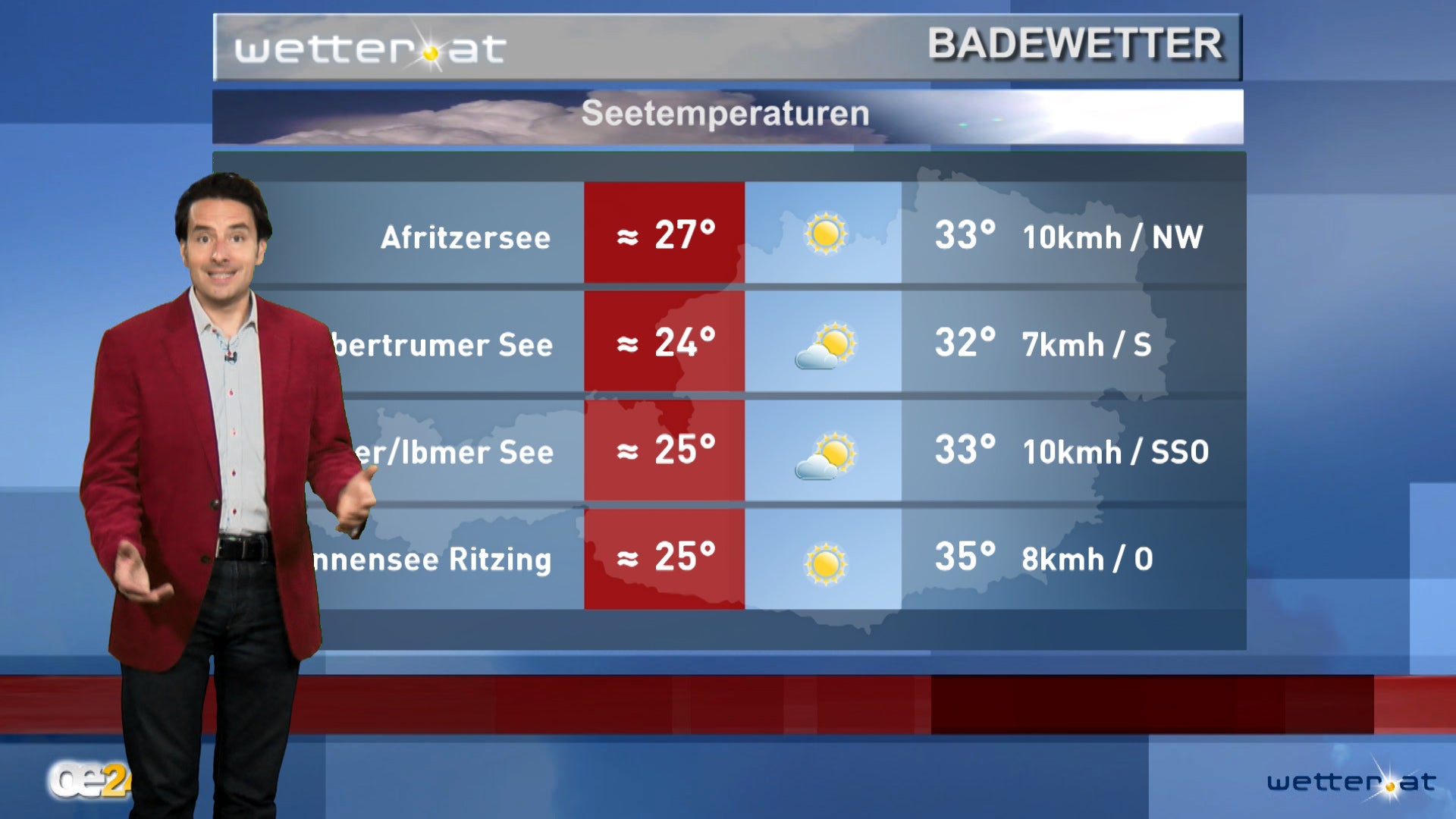 Bei der Hitze am besten ins Freibad und hier bietet in Kärnten der Afritzersee 27 Grad Wassertemperatur an, in Salzburg hat der Obertrumer See 24 Grad und mit 25 Grad baden sie in Oberösterreich im Heratinger/Ibmer See sowie im Burgenland im Badesee Ritzing.