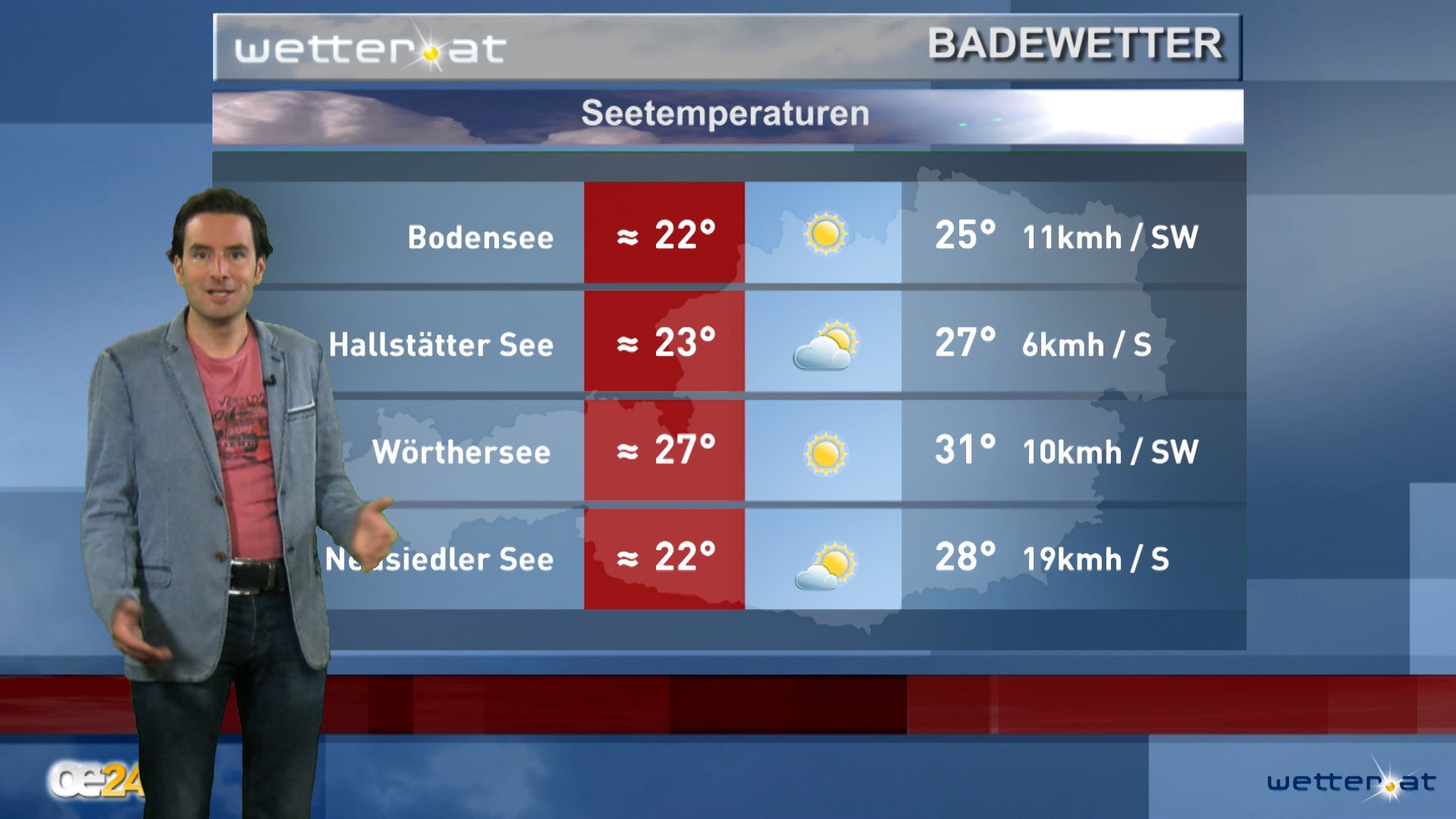 Wo das Wetter hält, da lässt es sich weiterhin wunderbar baden, die Wassertemperaturen sind angenehm herrlich, der Bodensee bei 22 Grad, der Oberösterreichische Hallstätter See mit 23 Grad, der Wörthersee in Kärnten mit wunderbaren 27 Grad und das Meer der Wiener, der burgenländische Neusiedlersee mit 22 Grad.