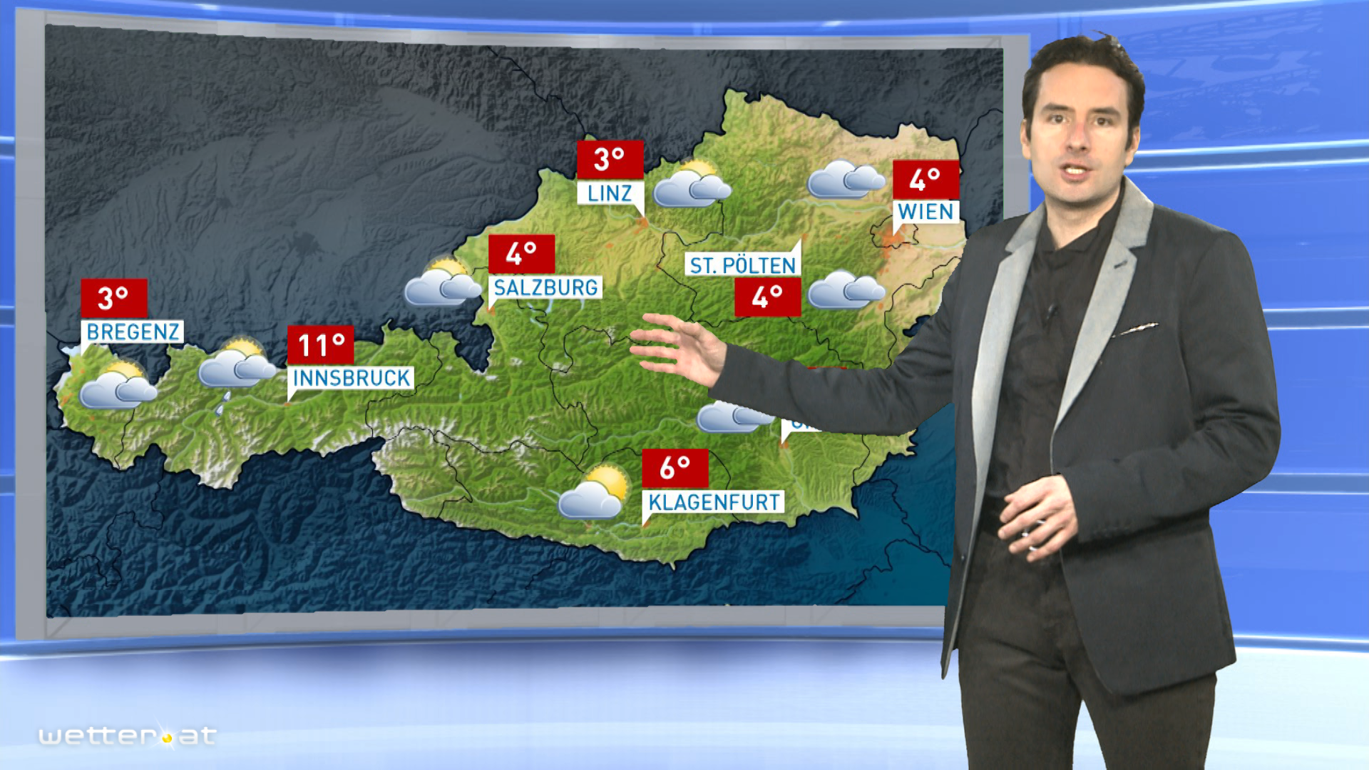 Über den Niederungen sowie in Becken und Tälern im Osten und Südosten bleibt es weitgehend nebelig-trüb, gelegentlich kann außerdem ein wenig Nieselregen fallen.