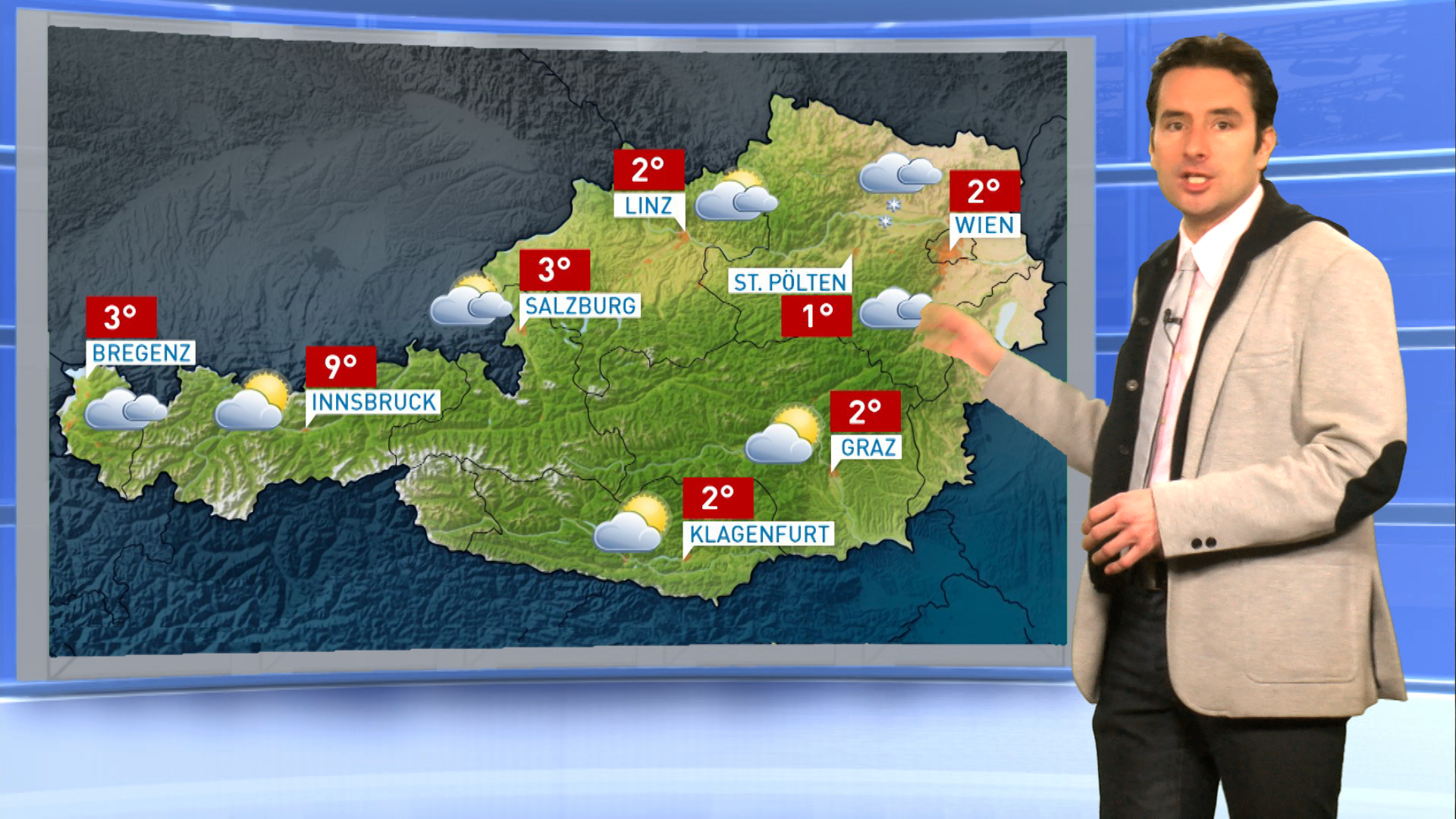 Über den Niederungen und in einigen Tälern sind zähe Nebel- oder Hochnebelfelder auch tagsüber wahrscheinlich, sonst ist es überwiegend freundlich mit nur hohen, dünnen Wolken. Alpennordseitig ist es örtlich föhnig. Der Wind weht schwach bis mäßig aus Nordost bis Süd.