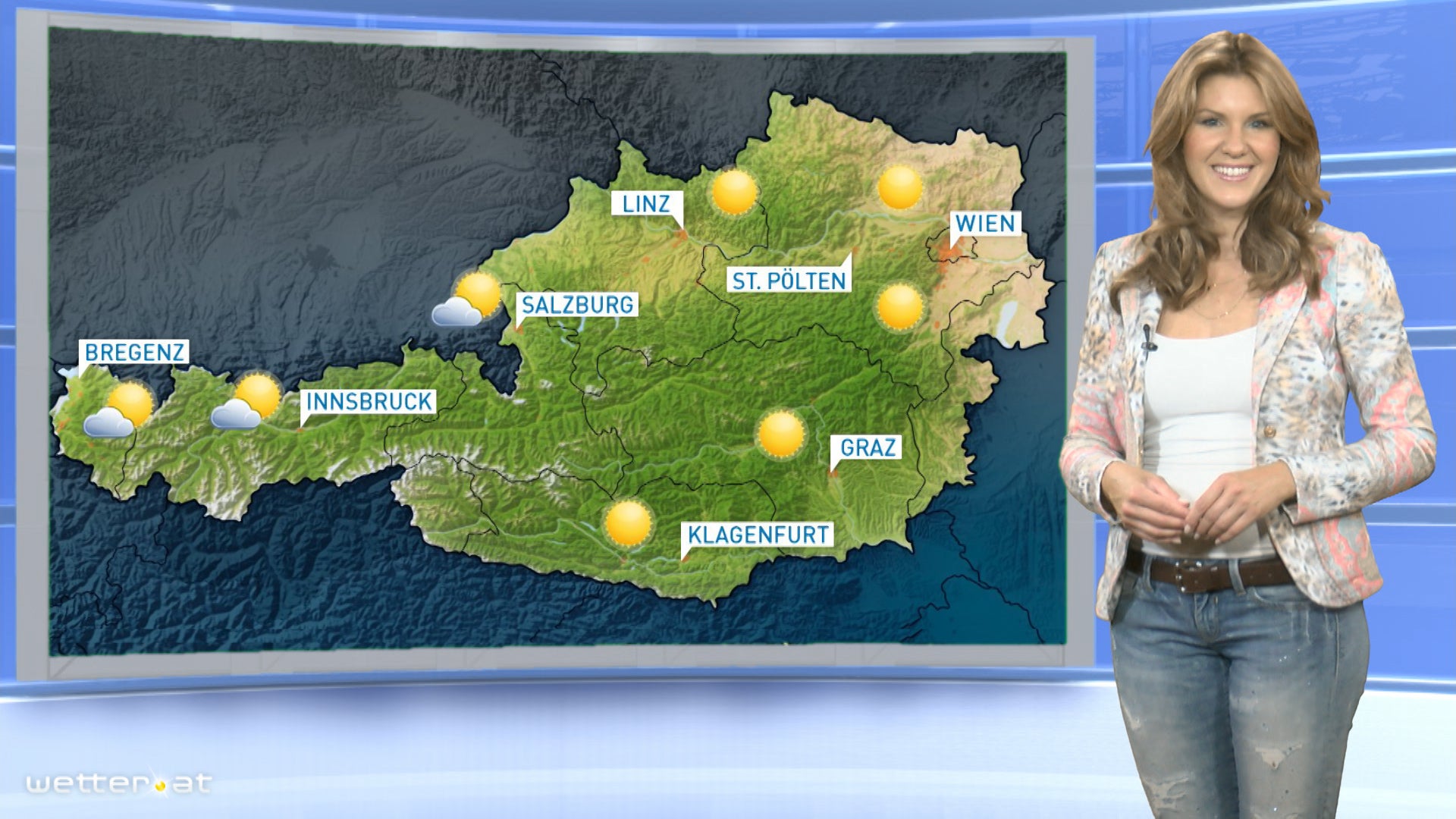 In weiten Landesteilen scheint die Sonne den ganzen Tag über. Von Westen her ziehen allmählich hohe, dünner Wolken auf. Insgesamt bleibt es niederschlagsfrei, allenfalls ist zwischen der Silvretta und den Tauern mit isolierten Wärmegewittern zu rechnen. Der Wind weht meist mäßig, im Osten und in manchen Föhntälern lebhaft aus Südost bis Süd.
