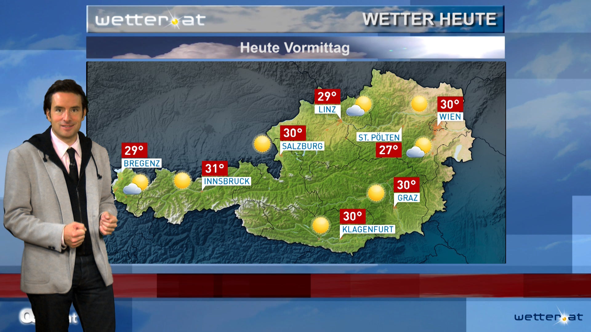 Hochdruckeinfluss sorgt weiterhin für sonniges und stabiles Wetter. Selbst im Bergland ist die Schauer- und Gewitterneigung nur gering, isolierte Wärmegewitter am Alpenhauptkamm und südlich davon sind jedoch nicht auszuschließen. Schwach windig.
