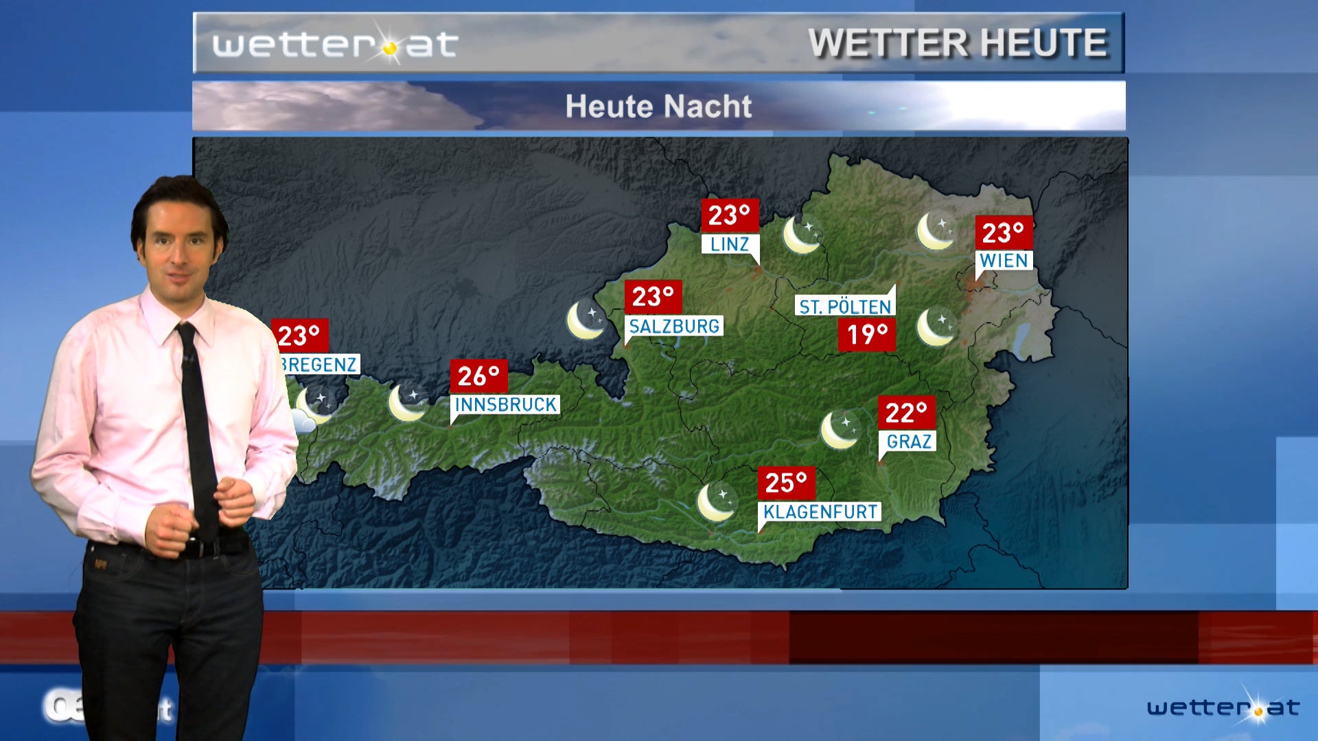 Abermals überwiegt strahlender Sonnenschein und vielfach zeigt sich der Himmel sogar wolkenlos. Selbst im Bergland entwickeln sich nur einzelne, harmlose Quellwolken. Lediglich im westlichen Bergland, am Alpenhauptkamm und südlich davon, besteht geringe Schauer- und Gewitterneigung.