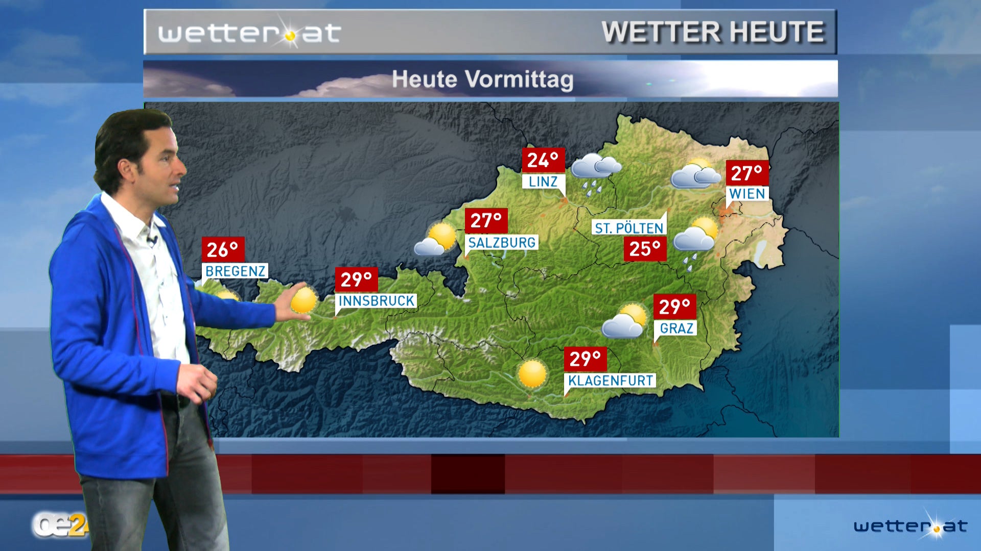 Von Westen ziehen im Tagesverlauf dichte Wolken, Regenschauer und Gewitter langsam in Richtung Osten. Bereits um die Mittagszeit beruhigt sich jedoch in Vorarlberg, Tirol und Salzburg das Wetter. In der Folge lassen auch weiter im Osten letzte gewittrige Regenschauer nach und der Tag endet noch oft mit Sonnenschein. Am längsten gewittrig bleibt es über dem östlichen Bergland. Wetterbegünstigt ist insgesamt die Alpensüdseite mit nur lokalen gewittrigen Schauern.