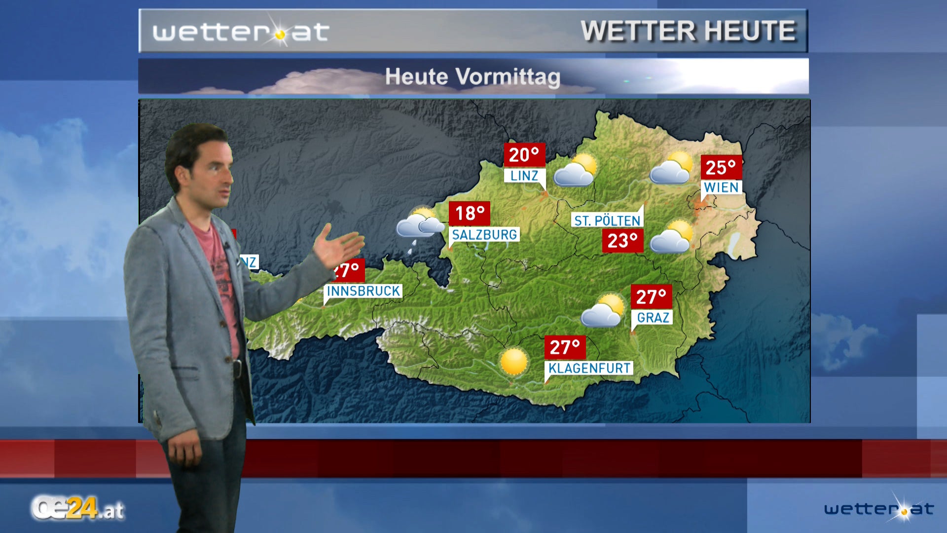 Am Nachmittag beginnt es im Norden Österreichs aufzulockern, wolkig im Westen, Bregenz bei 19 Grad, in Tirol bis 28 Innsbruck und wolkig-regnerisch auch in Salzburg bei 20, dazu die östlichen Bundesländer bis 26 Grad und wolkig, wieder die Steiermark und Kärnten sonniger und wärmer.