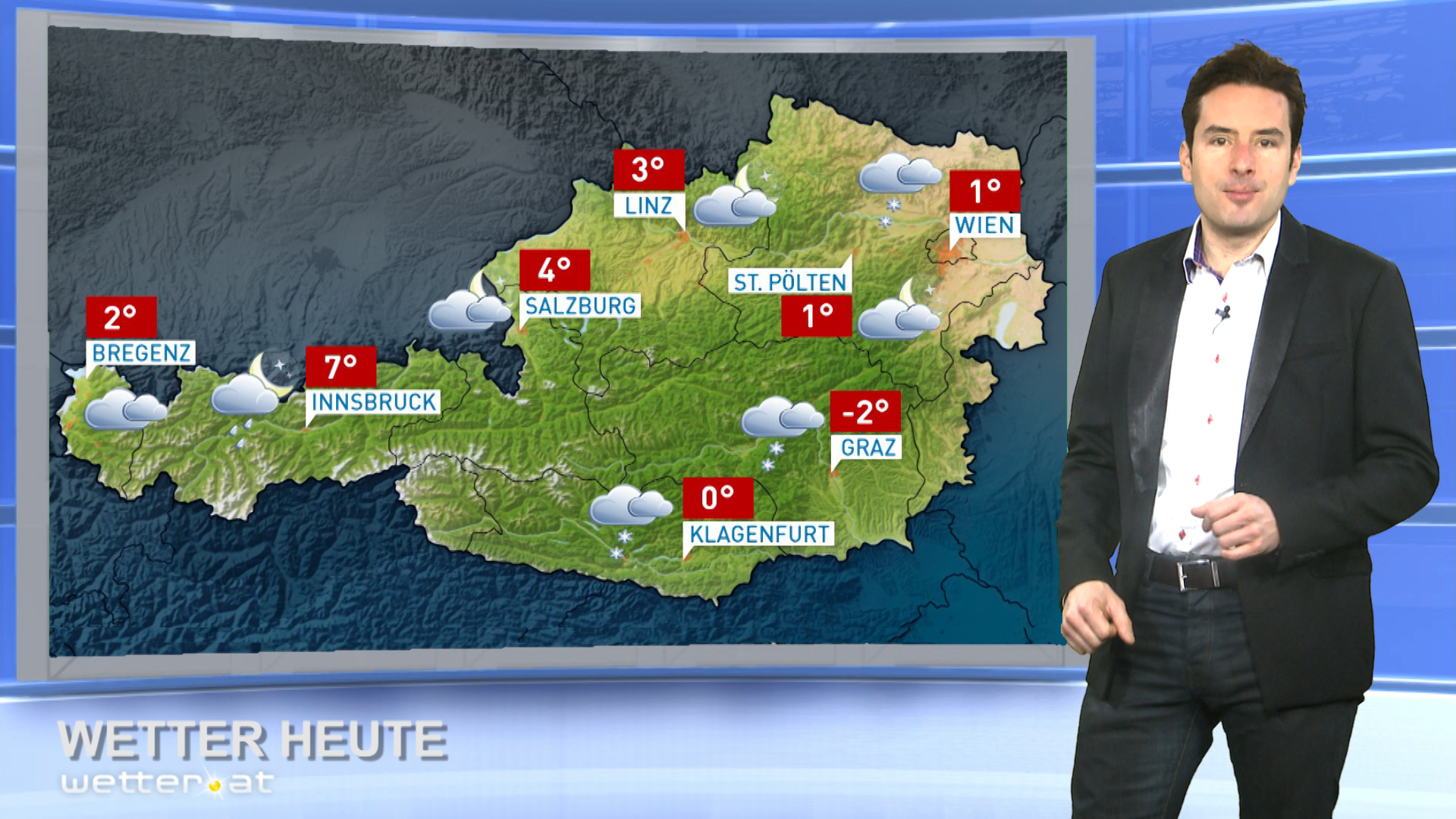 Südlich des Alpenhauptkammes sowie im Südosten Österreichs ist der Himmel meist wolkenverhangen. Dazu schneit es häufig, am meisten in Osttirol und Oberkärnten. Entlang der Alpennordseite zwischen Vorarlberg und dem westlichen Niederösterreich zeigt sich die Sonne föhnbedingt häufiger.