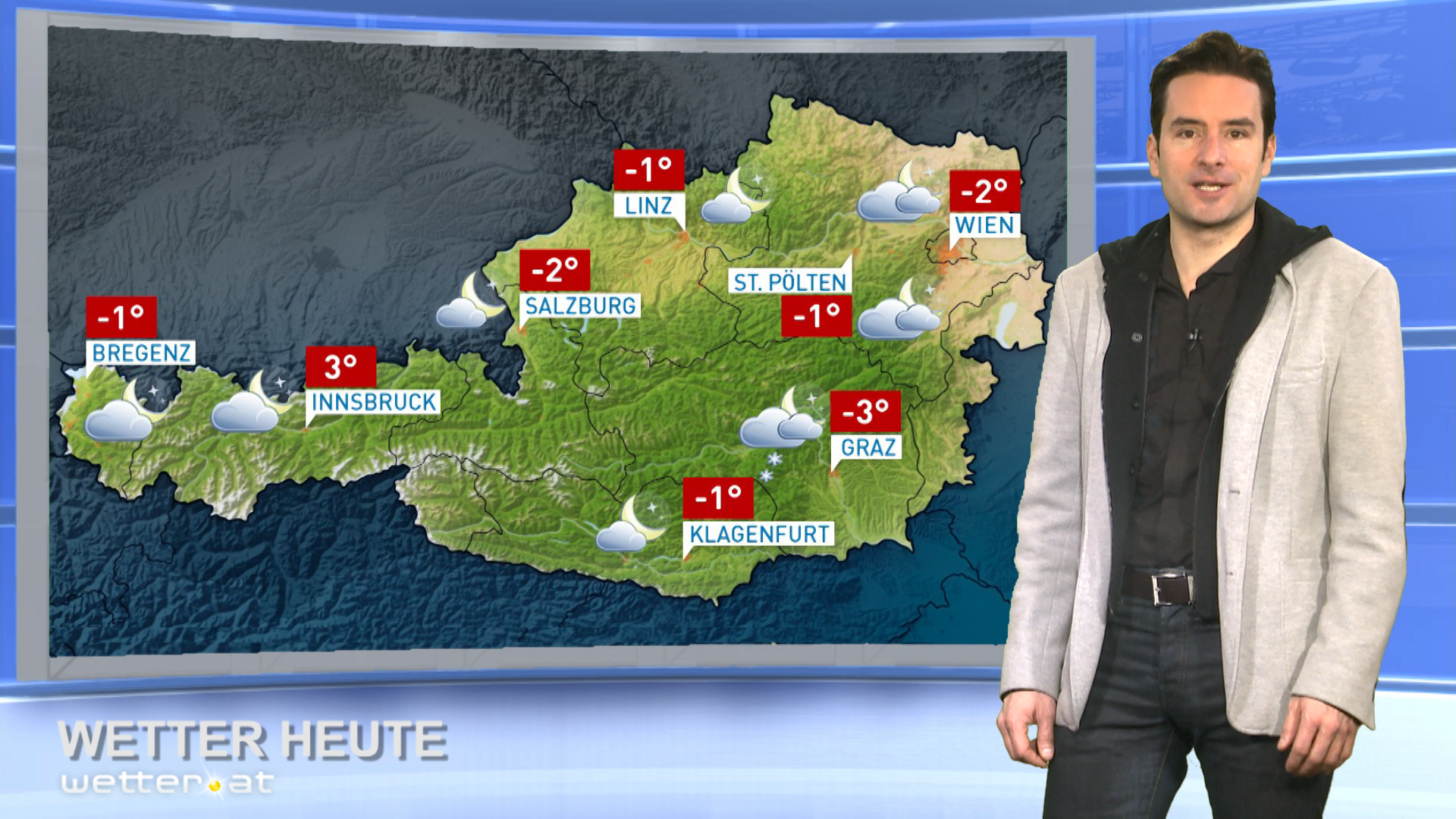 Im Westen überwiegt freundliches, teils sonniges Wetter, auch entlang der Alpennordseite lockert der föhnige Wind die Bewölkung immer wieder auf. Im Südosten und Osten überwiegen Wolken und immer wieder ist mit ein paar Schneeflocken zu rechnen.