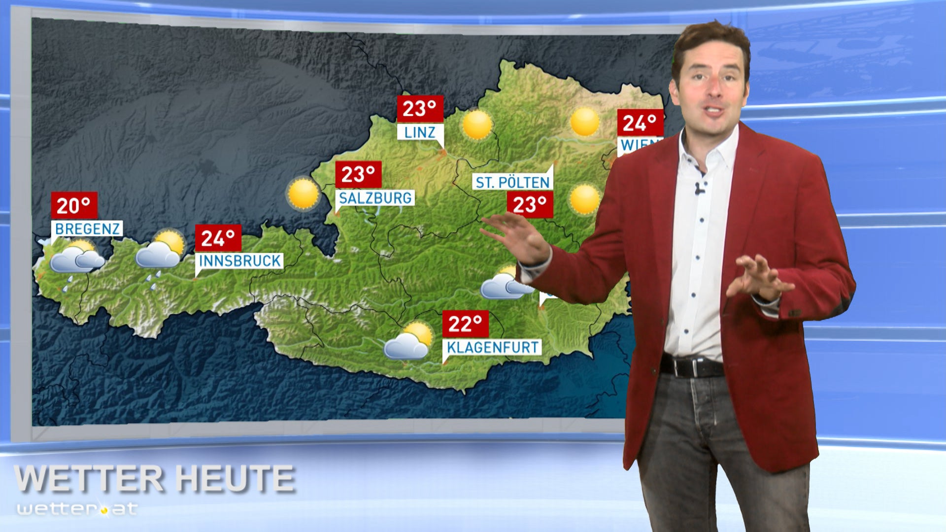 In weiten Teilen des Landes bringt der Vormittag sonniges Wetter und nur wenige Wolken. Dann setzt aber Quellwolkenbildung ein und im Westen, Süden und über den Bergen entstehen nachfolgend örtliche Regenschauer. Gewittrige Einlagerungen sind aber kaum dabei.