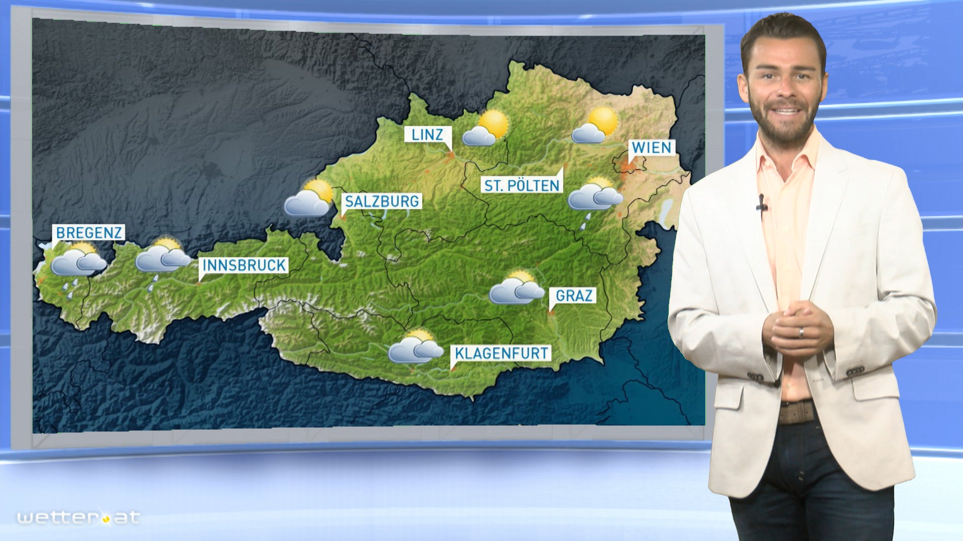 Zunächst halten sich Wolkenreste nächtlicher Gewitter. Am Vormittag kommt ab und zu die Sonne durch, dann können aber rasch Quellwolken entstehen, die nachfolgend wieder Schauer und Gewitter bringen. Gebietsweise wolkenlos kann es anfangs noch im Südosten sein, besonders die Gewitter, die hier entstehen, können örtlich kräftig ausfallen.
