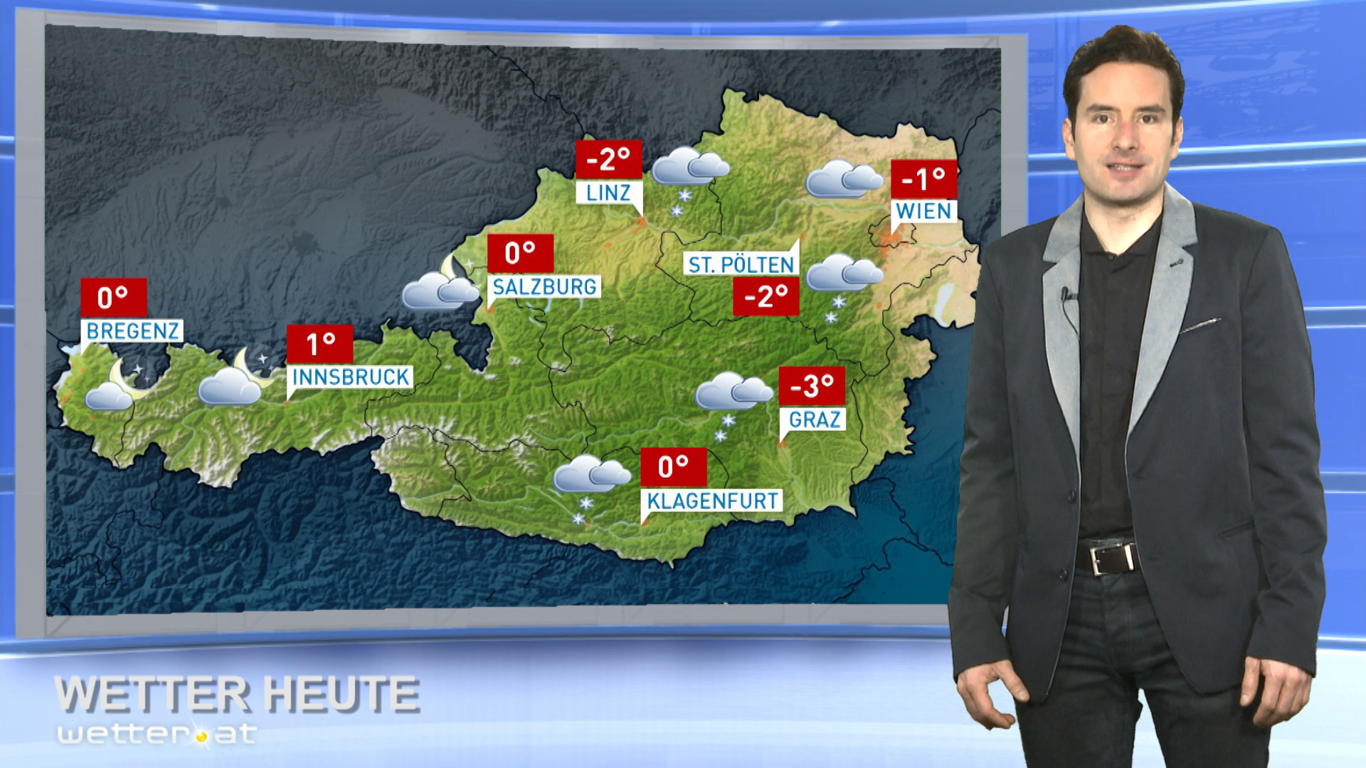In weiten Teilen des Landes überwiegt starke Bewölkung, sonnige Abschnitte gibt es lediglich im Westen am Nachmittag. Zudem ist vor allem im Bergland sowie im Südosten mit etwas Schneefall zu rechnen, überall sonst bleibt es meist bei einzelnen Schneeflocken.