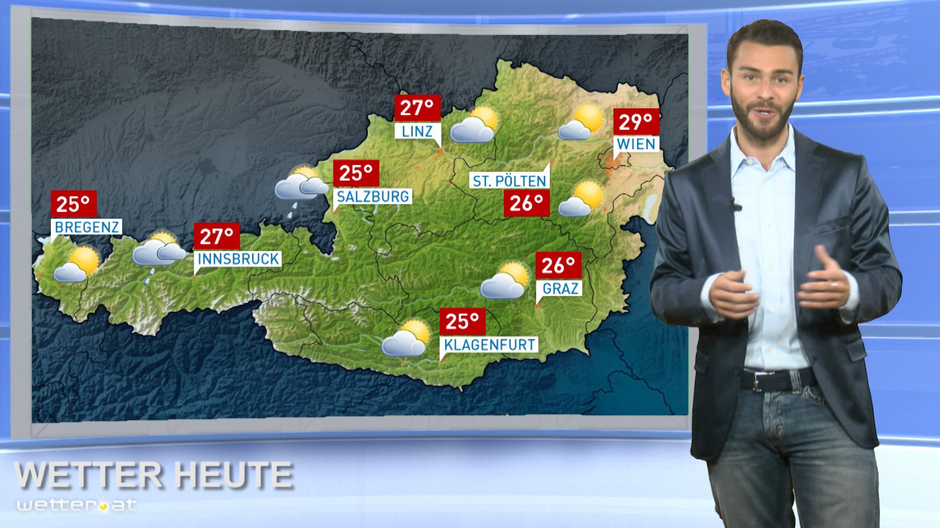 Der sonnige Wettercharakter überwiegt, auch wenn im Laufe des Tages wieder einige Quellwolken entstehen. Lokale Regenschauer und Gewitter beschränken sich meist auf den Alpenhauptkamm sowie auf den äußersten Osten und Südosten.
