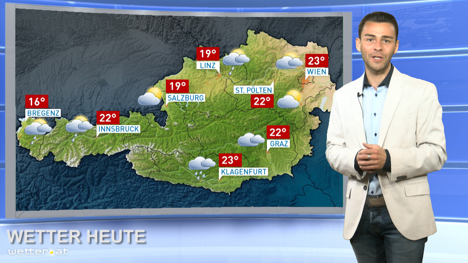 Von West nach Ost ziehen stärkere Wolkenfelder durch und es regnet auch regional etwas. Später zeigt sich wieder öfter die Sonne, ein paar Regenschauer sind aber vor allem in der Westhälfte des Landes weiterhin dabei, vereinzelt auch Gewitter, vor allem im Süden, wo es auch den meisten Sonnenschein gibt.