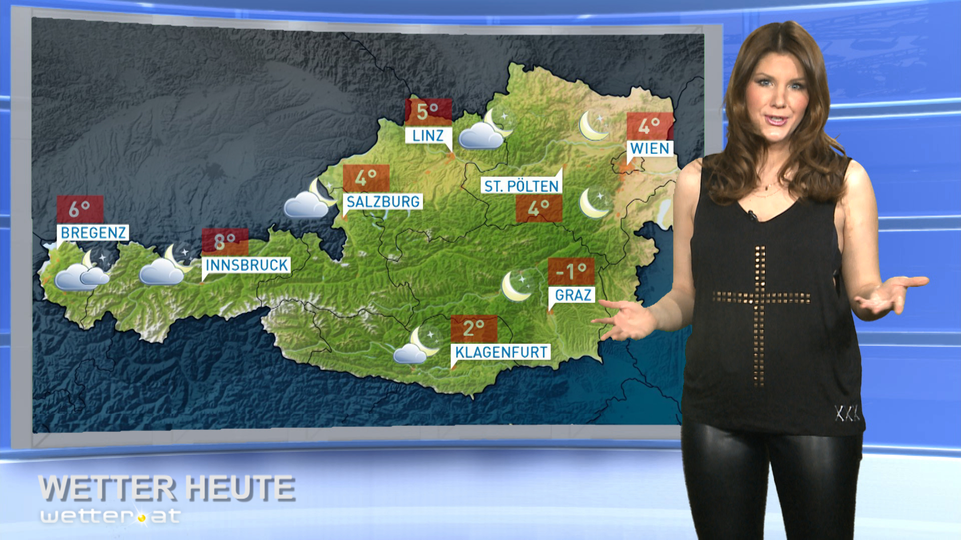 In Vorarlberg und Nordtirol lockert die Bewölkung rasch auf und es wird zunehmend sonnig. Überall sonst verläuft vor allem der Vormittag stärker bewölkt, zum Teil auch nebelig und zudem fällt gebietsweise auch etwas Regen oder Schnee. Die Schneefallgrenze bewegt sich zwischen 600 und 1000m Seehöhe. In Kaltluftseen im Flachland besteht örtlich die Gefahr von gefrierendem Regen.