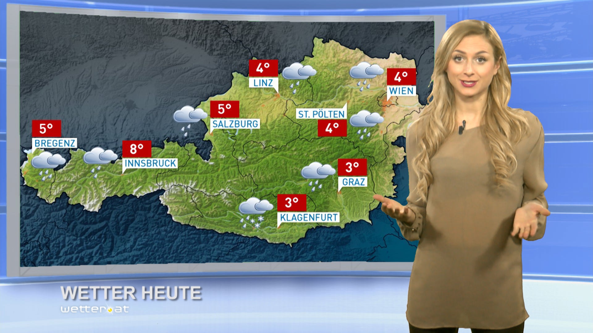Abgesehen von lokalen Auflockerungen dominiert starke bis geschlossene Bewölkung, über den Niederungen teils auch Nebel oder Hochnebel, und von Westen und Südwesten breitet sich Regen bis zum Abend auf weite Teile Österreichs aus. Die Schneefallgrenze liegt tagsüber zwischen 1000 und 1600m Seehöhe und sinkt bis zum Abend allmählich auf 800m bis 1400m Seehöhe, wobei sie im Süden am höchsten liegt.