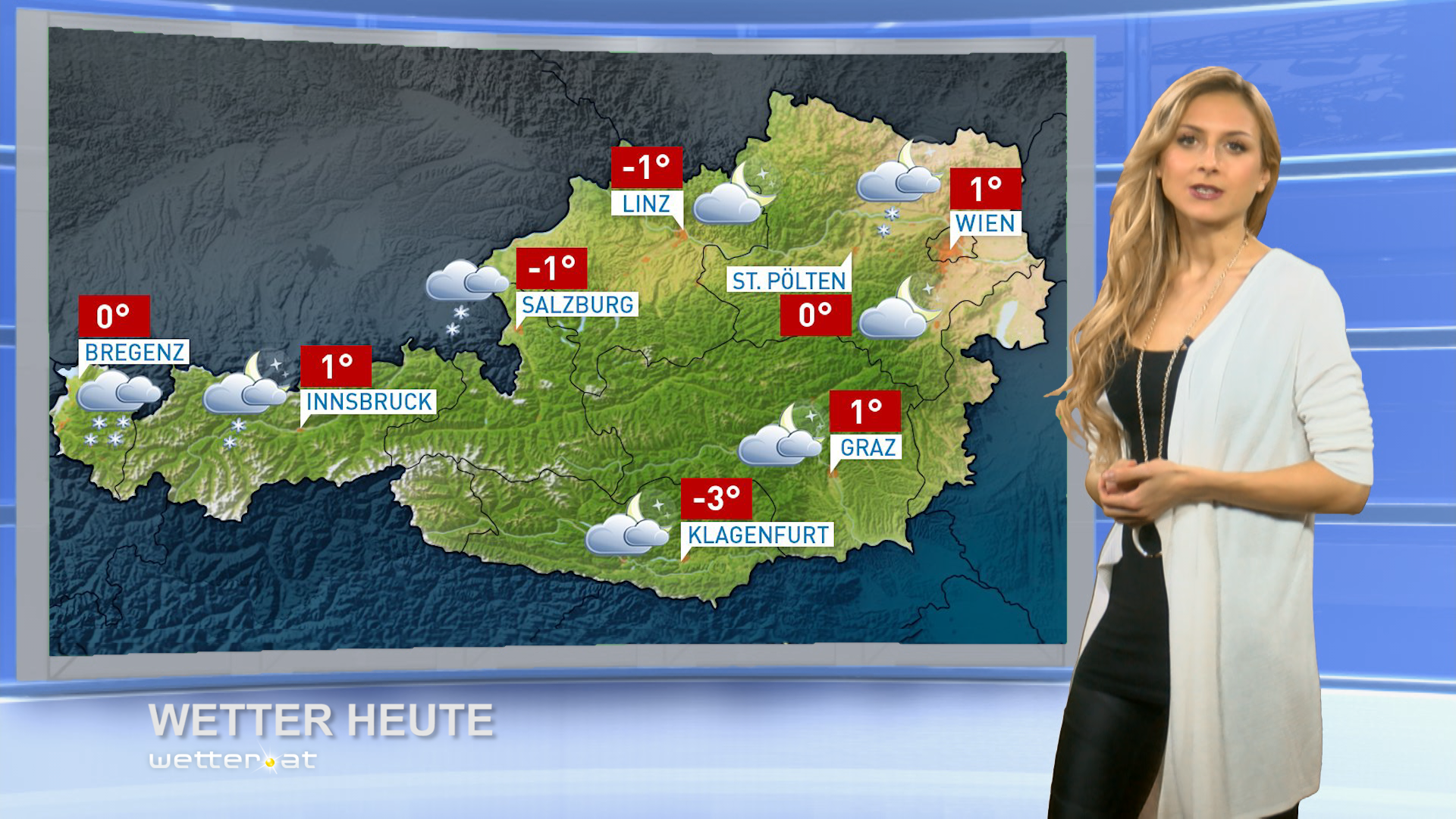 An der Alpennordseite muss zeitweise mit etwas Schneefall gerechnet werden, vor allem von Vorarlberg bis Salzburg. Weiter im Norden und Osten bleibt es bei kurzen Schneeschauern. Im Süden bleibt es trocken und die Wolken lockern immer wieder ein wenig auf. Der Wind weht mäßig bis lebhaft aus West bis Nordwest.