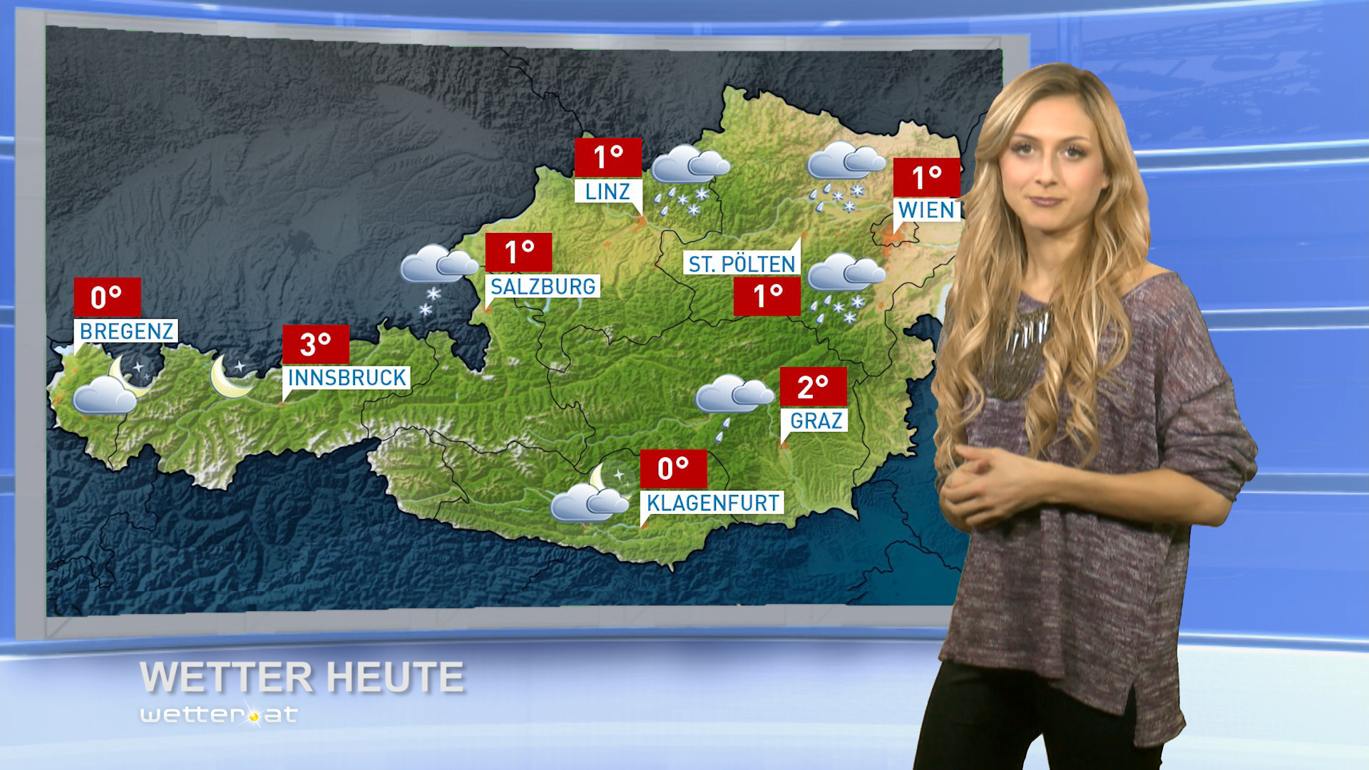 Eine Störungszone bringt an der Alpennordseite vom Tiroler Unterland bis zum Burgenland und generell im Osten teils kräftigen Schneefall, besonders am Nachmittag. Ganz im Westen und im Süden schneit es kaum und es gibt immer wieder ein paar Auflockerungen. In der Nacht geht der Schneefall in den Niederungen in Regen über. Der Wind weht lebhaft bis stark aus Nordwest, im Westen und Süden bleibt es eher schwach windig. Die Temperaturen steigen von Frühwerten zwischen minus 8 und minus 1 Grad, auf Höchstwerte von minus 2 bis plus 3 Grad.