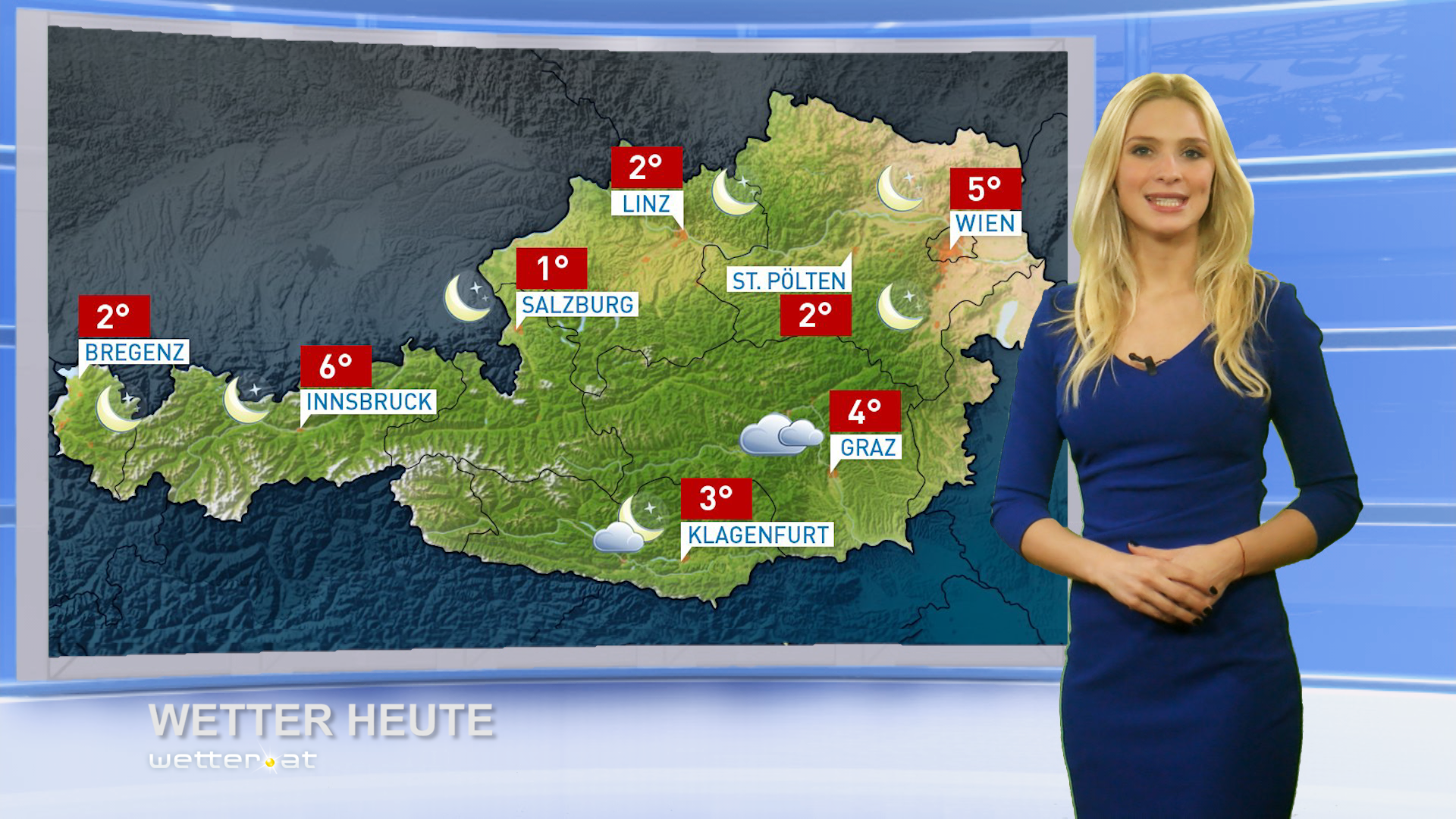 Erneut kann im Westen und im Gebirge mit strahlend sonnigem Wetter gerechnet werden. In Tälern und Becken im Osten und Süden und nördlich der Donau muss mit zähen Nebel oder Hochnebelfeldern gerechnet werden, aus denen es ab und zu sogar leicht nieseln oder schneegrieseln kann. Der Wind weht nur schwach, lediglich im Osten kommt mäßiger Südostwind auf. Die Temperaturen bewegen sich in der Früh zwischen minus 9 und 0 Grad, tagsüber werden in den sonnigen Regionen 5 bis 12 Grad erreicht, bei zähem Nebel bleibt es meist etwas kälter.