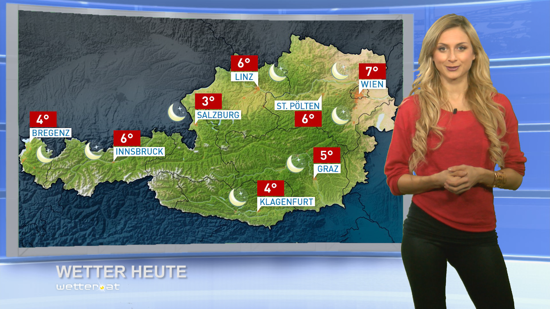 Über den Niederungen sowie in Tälern und Becken startet der Tag erneut mit Nebel und Hochnebel. Diese lösen sich im Tagesverlauf aber zusehends auf und machen der Sonne Platz. Nur regional wie etwa im oberösterreichischen Zentralraum sowie am Bodensee kann es auch lange trüb bleiben. Der Wind weht schwach bis mäßig, im Donautal und entlang der Alpennordseite zeitweise lebhaft aus Nordost bis Süd. Frühtemperaturen minus 9 bis plus 1 Grad, Tageshöchsttemperaturen je nach Nebel oder Sonne 0 bis 11 Grad.