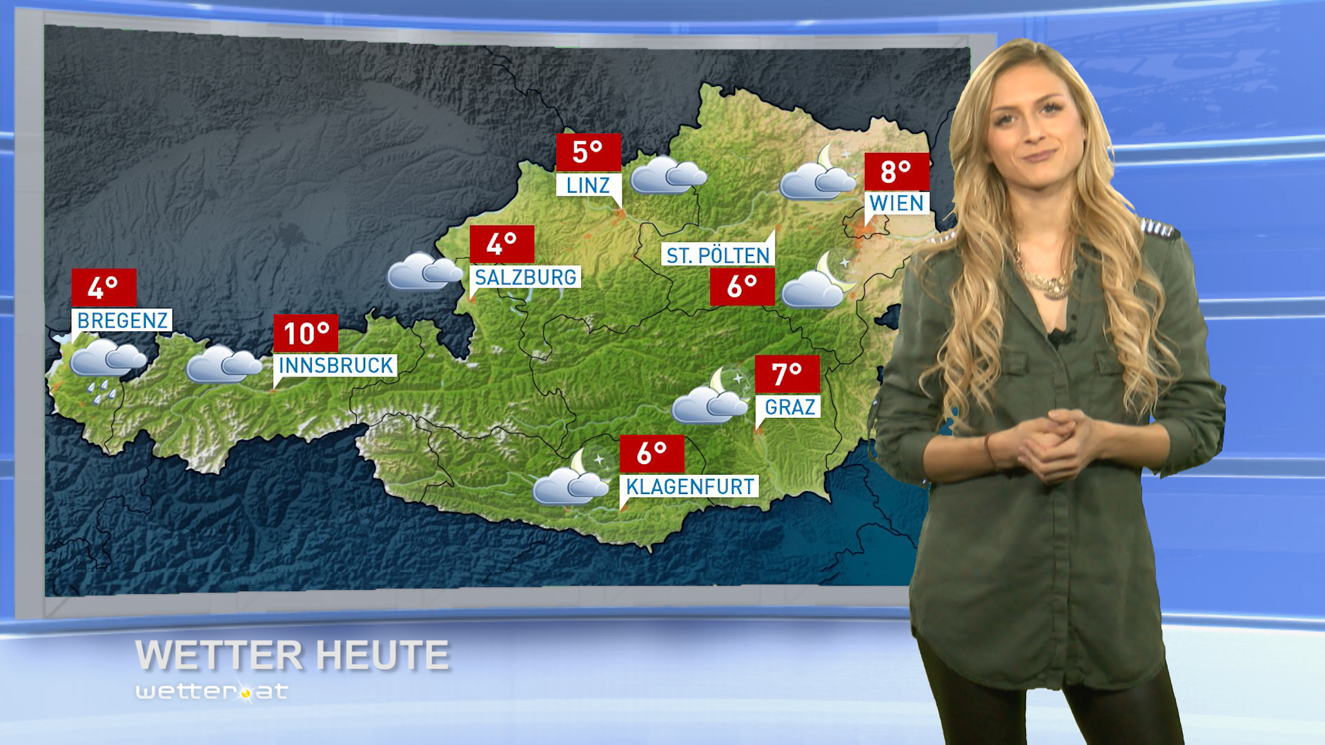 Über der Osthälfte halten sich Hochnebel und hochnebelartige Schichtbewölkung oft hartnäckig und machen erst im Laufe des Nachmittags der Sonne Platz. Weiter im Westen startet der Tag hingegen bereits sonnig, hier ziehen allerdings tagsüber dichte Wolkenfelder auf. Abends setzt von Vorarlberg bis ins westliche Innviertel Regen ein. Schnee fällt oberhalb von 1000 bis 1300m Seehöhe. Der Wind weht schwach bis mäßig aus Südost bis West. Frühtemperaturen minus 6 bis plus 4 Grad, inneralpin bis zu minus 10 Grad, Tageshöchsttemperaturen 3 bis 11 Grad