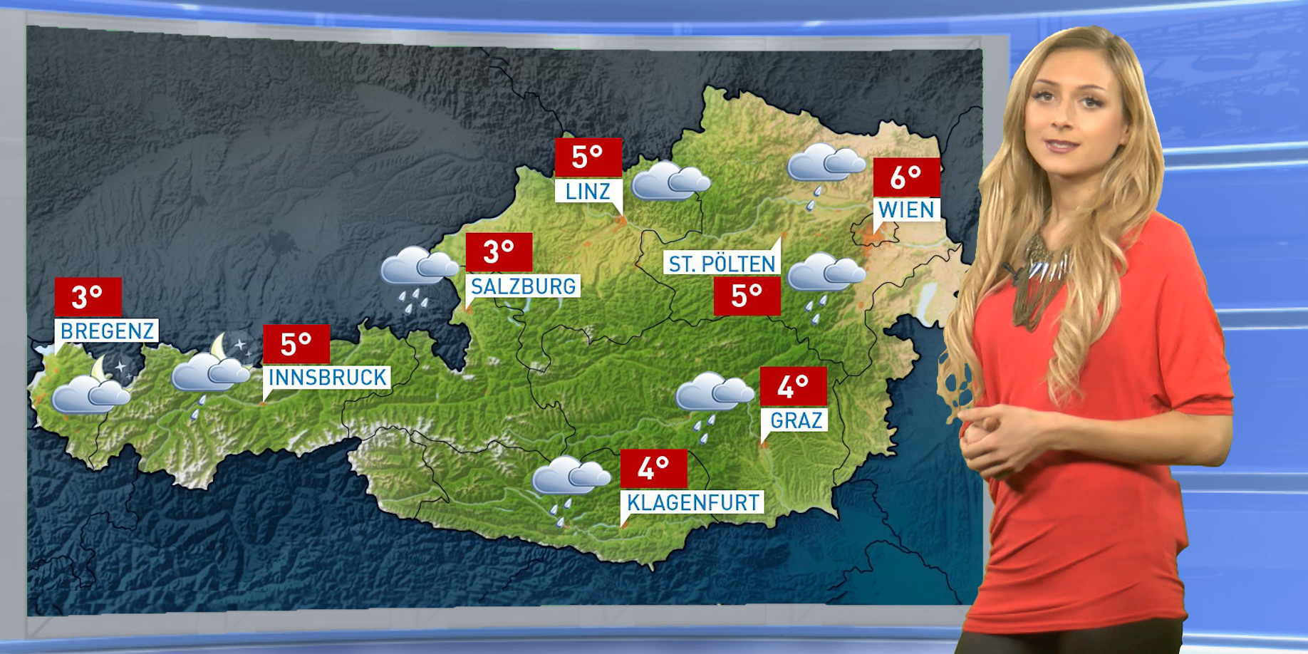 Kompakte, mehrschichtige Bewölkung bringt über weiten Teilen des Landes Regen, Schneeregen und Schneefall. Am meisten regnet oder schneit es im Süden und Südosten, die Schneefallgrenze schwankt meist zwischen 500 und 800m Seehöhe, bei kräftigen Niederschlägen ist etwa in Unterkärnten auch Schneefall bis in tiefe Lagen möglich. Der Wind weht schwach bis mäßig vorwiegend aus West bis Nordwest.