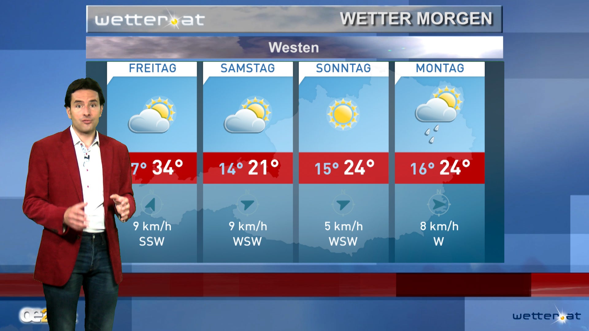 Die zwei Tiefs greifen stärker ein, der Donnerstag wolkig bei noch heißen 25 bis 34 Grad, der Freitag kühlt den Westen ab auf 20 bis 24 Grad und das Wochenende wird wolkig bei abgekühlten 18 bis 24 Grad am Samstag und bis 25 am Sonntag. Hitzerekorde dagegen im Osten und Süden.